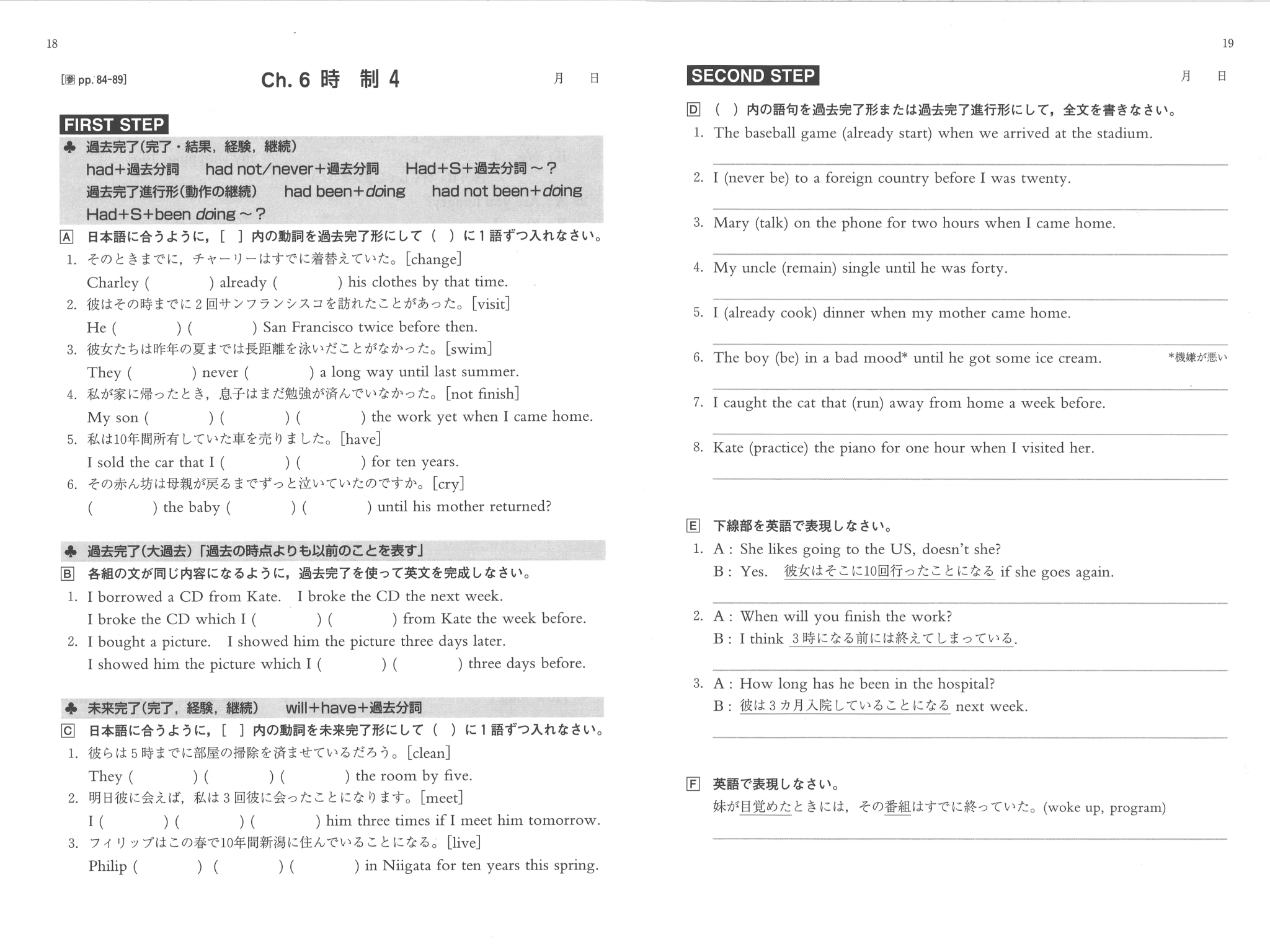 - FIRST STEPとSECOND STEPの2段構成。FIRST STEPで書き入れた例文を参考にしながらSECOND STEPの問題を解く形式。効率よく重要なことが覚えられます。